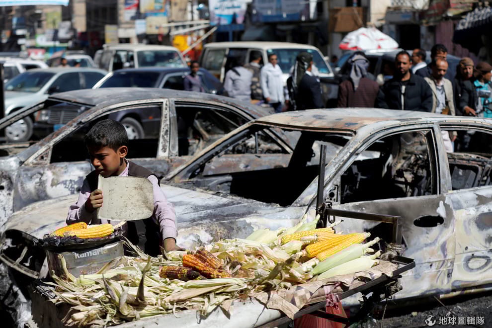 在葉門首都沙那(Sanaa),一名小男孩在損毀的車上販售玉米。胡西組織(Houthi)成員與葉門前總統沙雷(Ali Abdullah Saleh)的支持者最近才在這裡發生衝突。