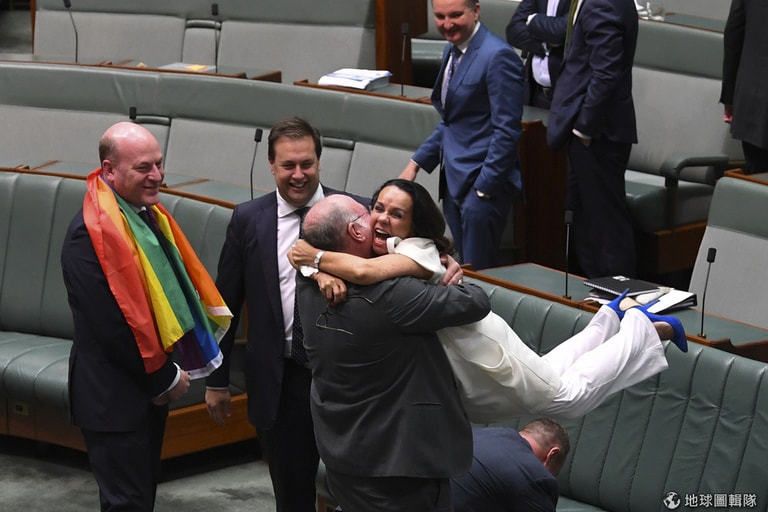澳洲自由黨議員恩特(Warren Entsch)一把接住了跳起來的工黨議員伯爾奈(Linda Burney),開心慶祝澳洲聯邦眾議院在本月 7號通過了婚姻平權法案。