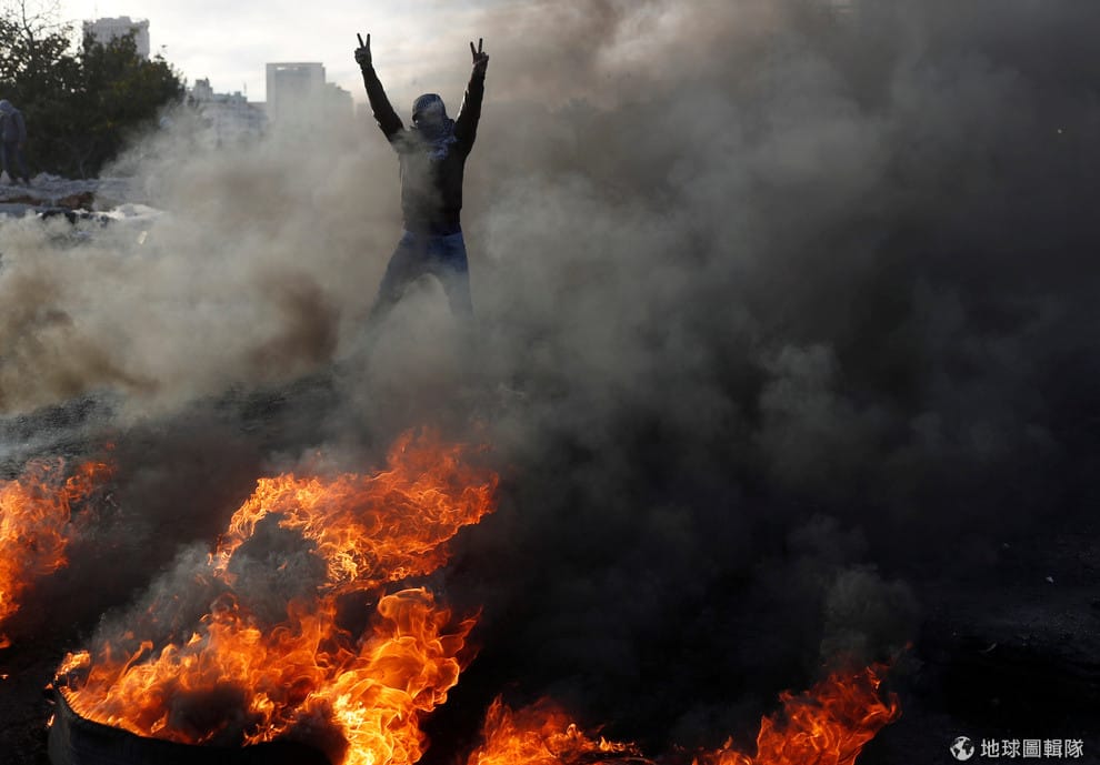 在以色列定居地Beit El前,來自巴勒斯坦城市拉姆安拉(Ramallah)的抗議者放火燒毀前方的路障,並且比出勝利手勢,抗議美國政府在本月 6號承認耶路撒冷為以色列首都,還打算把大使館搬到耶路撒冷,而現在世界各地均出現相關抗議。