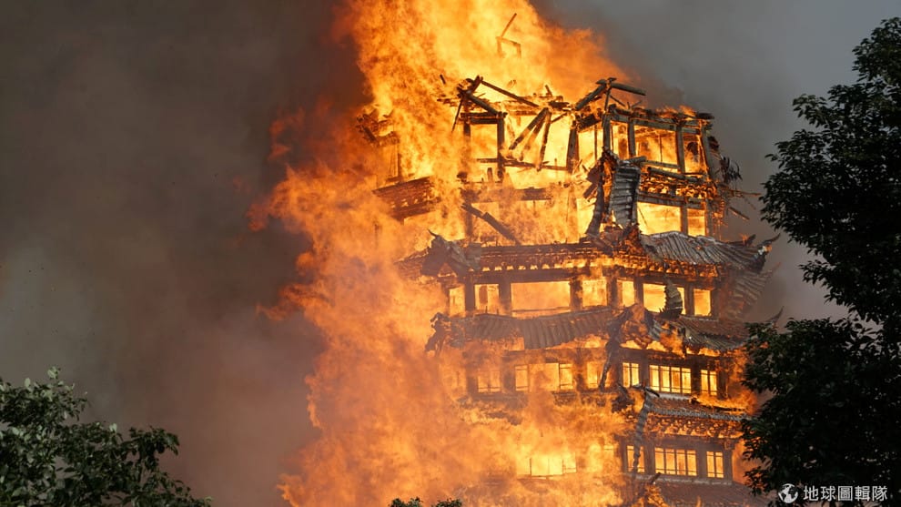 在四川綿竹市九龍鎮,16層樓高、有亞洲第一高木塔之稱的寺廟靈官樓被烈燄吞噬,整棟建築付之一炬。
