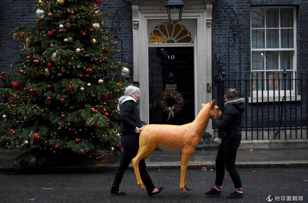 工作人員抬著馴鹿擺設來到英國首相官邸唐寧街十號,門前已經擺了一棵裝飾好的聖誕樹。