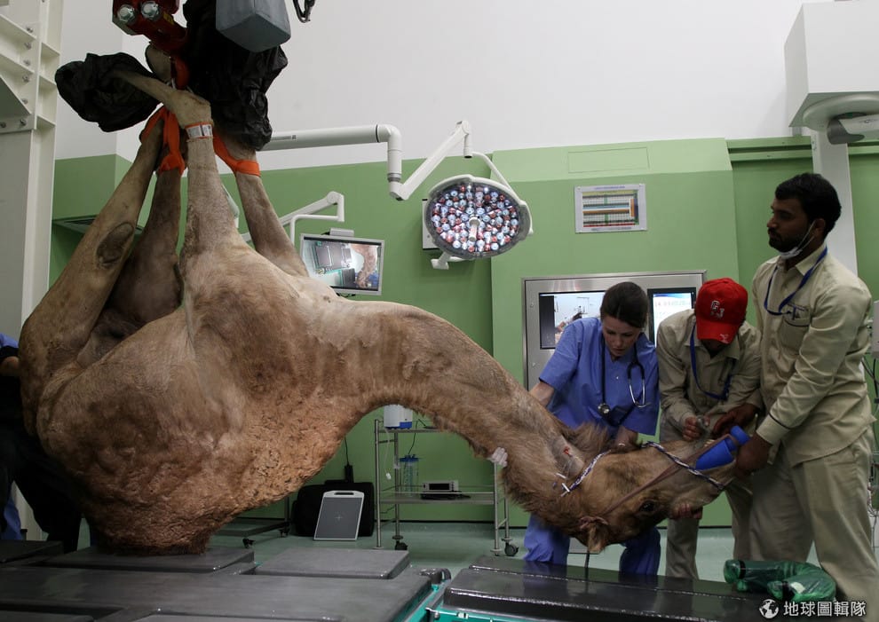 在杜拜的駱駝醫院裡,一隻駱駝被倒吊起來進行足部手術。