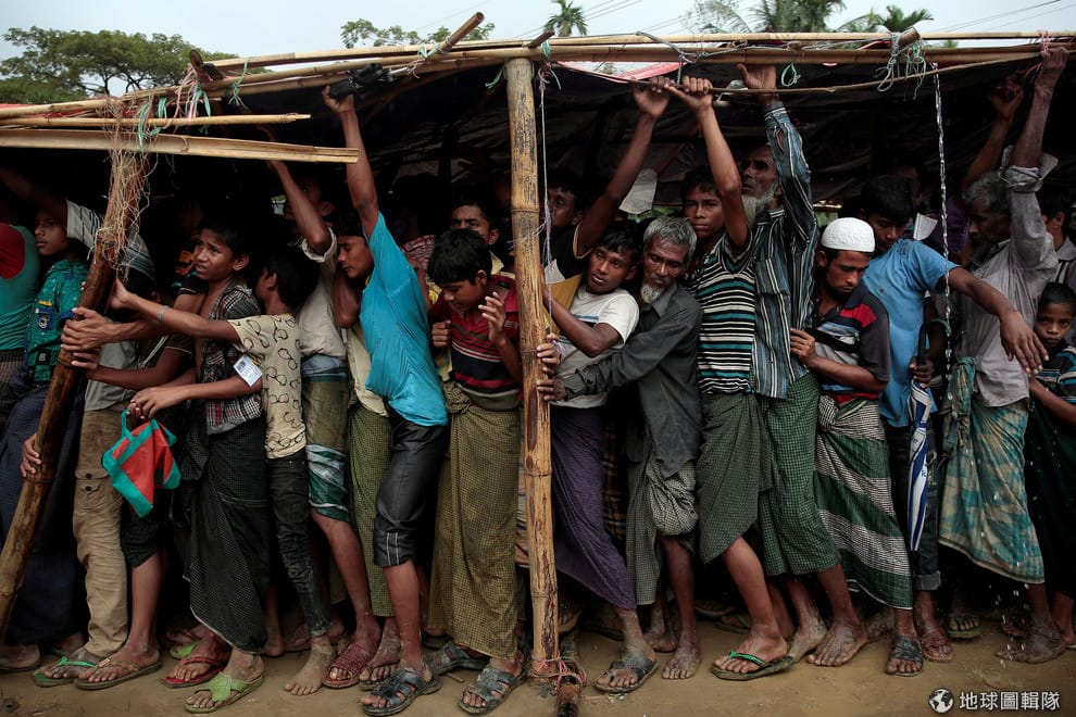 在孟加拉緊鄰緬甸的科克斯巴扎爾縣(Cox's Bazar)的難民營內,洛興雅難民排著隊,等待工作人員發放毛毯。