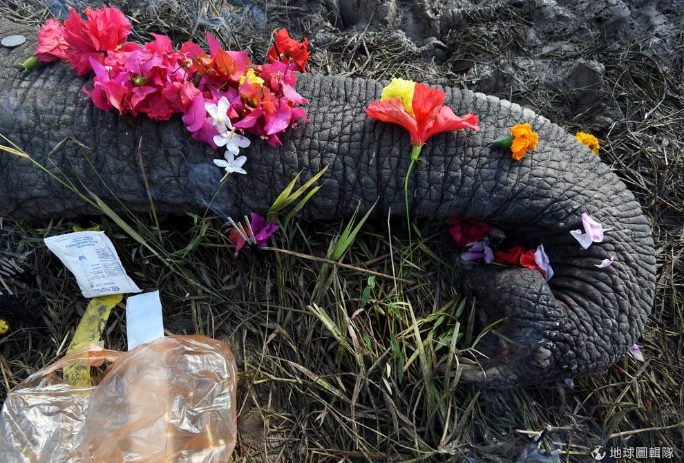 在東北部的阿薩姆邦(Assam),人們將花朵擺在一頭倒地的大象遺體上。根據林務官員的說法,這頭大象不小心在稻田裡觸電而死。
