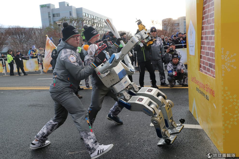 在大田廣域市的南韓科學技術院前,一具手拿 2018平昌冬奧火把的人形機器人HUBO,在傳遞聖火時不小心失去平衡,還好一旁工作人員趕緊上前幫忙。