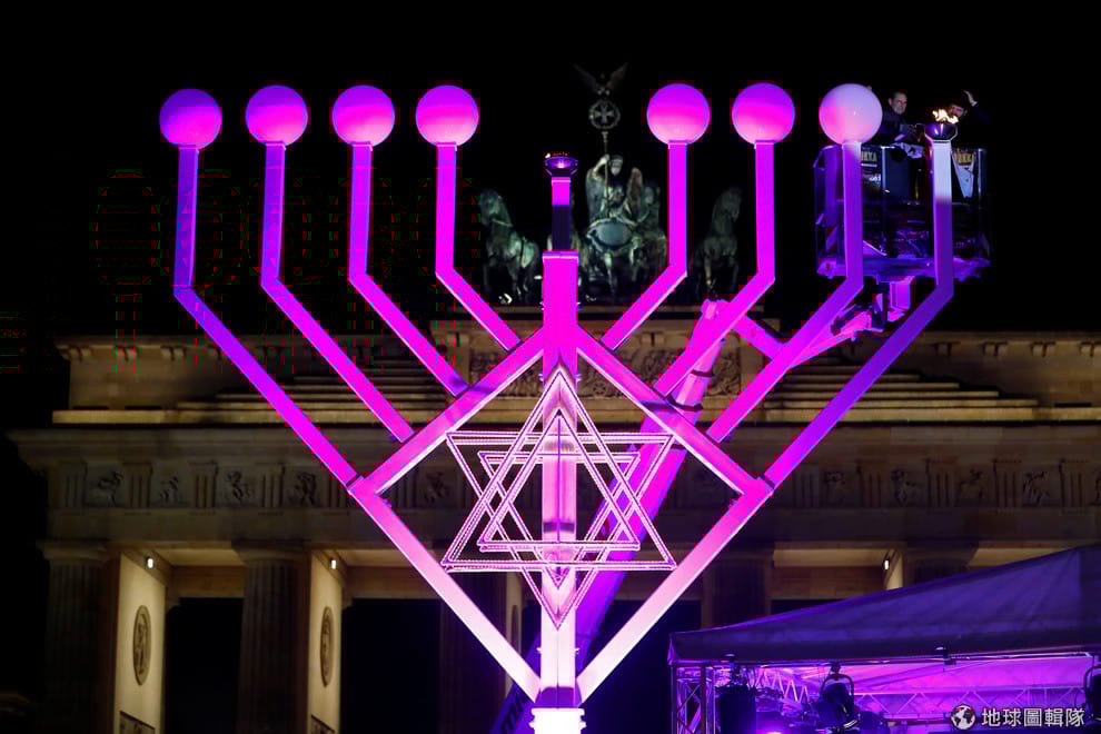 在柏林地標布蘭登堡城門前,柏林市長穆勒(Michael Mueller,右上角)舉行了猶太光明節(Hanukkah)點燈儀式,而他所點燃的燭台是全歐洲最大的光明節燭台。