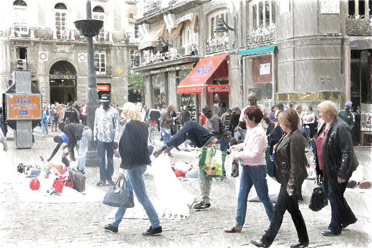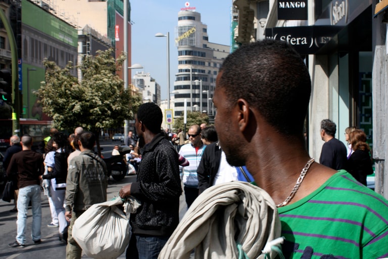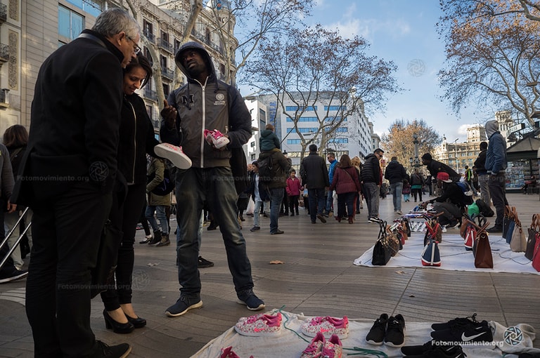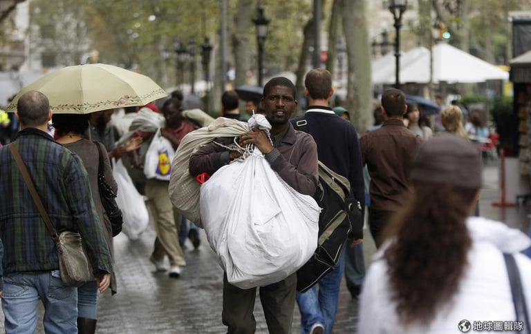 走在西班牙巴塞隆納遊人如織的老城區,你一定會看到這樣的景象:揹著白色毛毯的非裔人士,在大街上看好位置後把身後的白色毛毯攤開,毯子上放著各式各樣吸引觀光客的商品──太陽眼鏡、海灘巾、帽子,還有各式各樣比正品便宜了好幾倍的山寨名牌包、運動鞋。