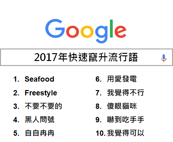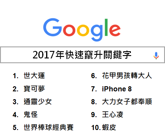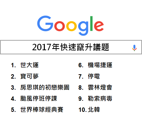 從今年快速竄升關鍵字總榜單可以看到,運動賽事是 2017 年大家最關注的焦點之一,「世大運」、「世界棒球經典賽」的搜尋量快速攀升,分占排行榜第一名與第五名。其中「世大運」主場在台灣,激發了國人愛台灣的凝聚力與向心力,更引發網友們對賽事、選手相關資訊的熱切搜尋,一舉奪下今年快速竄升關鍵字第一名。另外,台灣今年產出相當多本土優質戲劇,以仙姑索非亞的真實故事改編的「通靈少女」,及改編自楊富閔作家原著小說的「花甲男孩轉大人」,也成為台灣網友搜尋的一大重點。