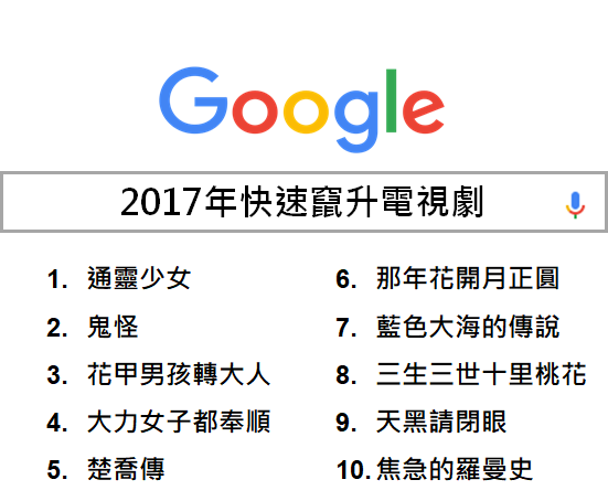 在電視劇部分,今年韓劇仍大幅攻占快速竄升電視劇榜單,「鬼怪」、「大力女子都奉順」等劇皆成熱搜關鍵字。但除此之外,許多本土製作的優質戲劇,以貼近台灣真實生活樣貌的故事內容引發共鳴,一樣引起台灣網友高度關注與熱搜。其中,以台灣民間信仰和宮廟文化為背景的「通靈少女」奪下第一名,更是讓台劇首度登上快速竄升電視劇榜冠軍。而改編自新銳作家楊富閔原著小說的「花甲男孩轉大人」、與台灣原創懸疑電視劇「天黑請閉眼」,則雙雙拿下排行榜第三名與第九名。