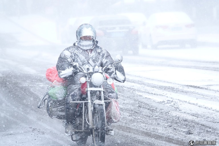 一名全身被白雪籠罩的摩托車騎士不畏寒冷,行駛在遼寧省大連市的街頭上。