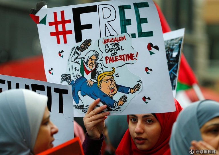 示威者的牌子上畫有美國總統川普(Donald Trump)被巴勒斯坦人打屁股的模樣,藉此抗議美國政府在本月 6號承認耶路撒冷為以色列首都,還打算把大使館搬到耶路撒冷,而現在世界各地均出現相關抗議。