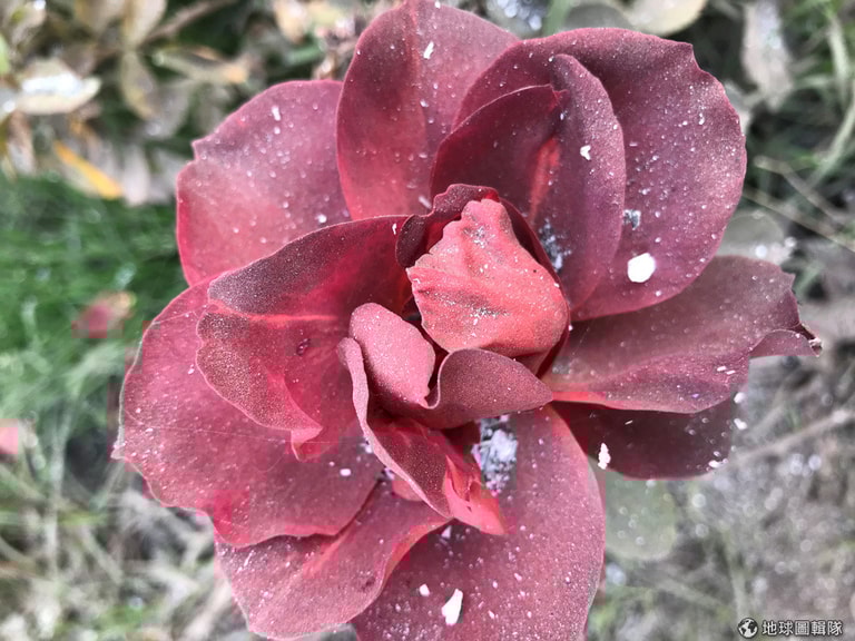 在加州城市卡平特里亞(Carpinteria)的玫瑰農場,一朵「熱可可」玫瑰(Hot Cocoa)被沾染上因為加州野火導致的灰燼。