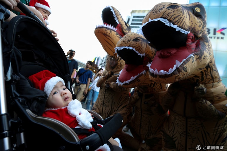 在泰國首都曼谷(Bangkok),一群身穿暴龍充氣裝的表演者站好位子,和眼前裝扮成聖誕老人的小嬰兒們打招呼。