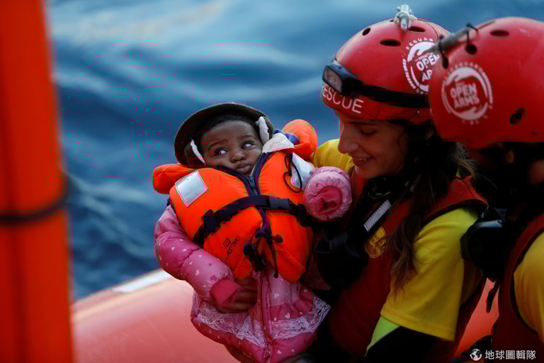 一名非營利組織海上難民救援隊(Proactiva OpenArms)的成員接過了移民寶寶。該組織與其他非營利機構定期會在靠近利比亞海岸的地中海地區巡航,負責尋找和救援海上移民。
