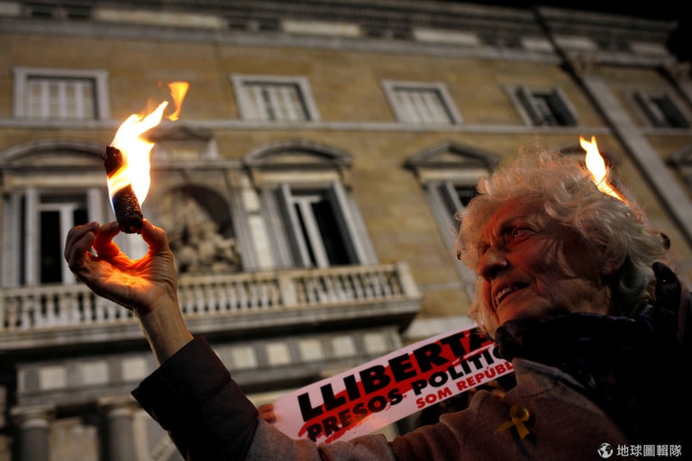 一名女子拿著火把,與其他人一同在巴塞隆納的聖若梅廣場(Sant Jaume square)遊行,他們希望西班牙政府可以釋放因為支持加泰隆尼亞獨立而被關押的示威人士與政治分子。