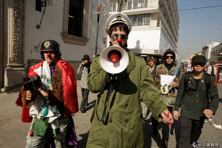 一群示威者打扮成士兵的模樣,抗議一條可以用軍事武裝力量打擊犯罪的法律。