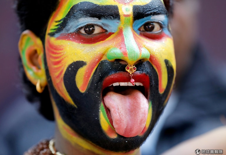 一名臉上畫著鮮豔油彩的表演者被攝影師捕捉下來。他正在慶祝 47歲的拉胡爾‧甘地(Rahul Gandhi)確定要成為印度最大反對黨國大黨(Congress)的主席。