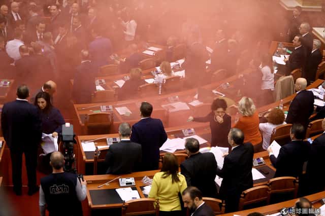 在首都地拉那(Tirana)的國會內,反對派國會議員不滿國家檢察官遴選結果,憤而在國會內丟擲煙霧彈抗議,讓整個會場瀰漫紅煙陷入混亂。