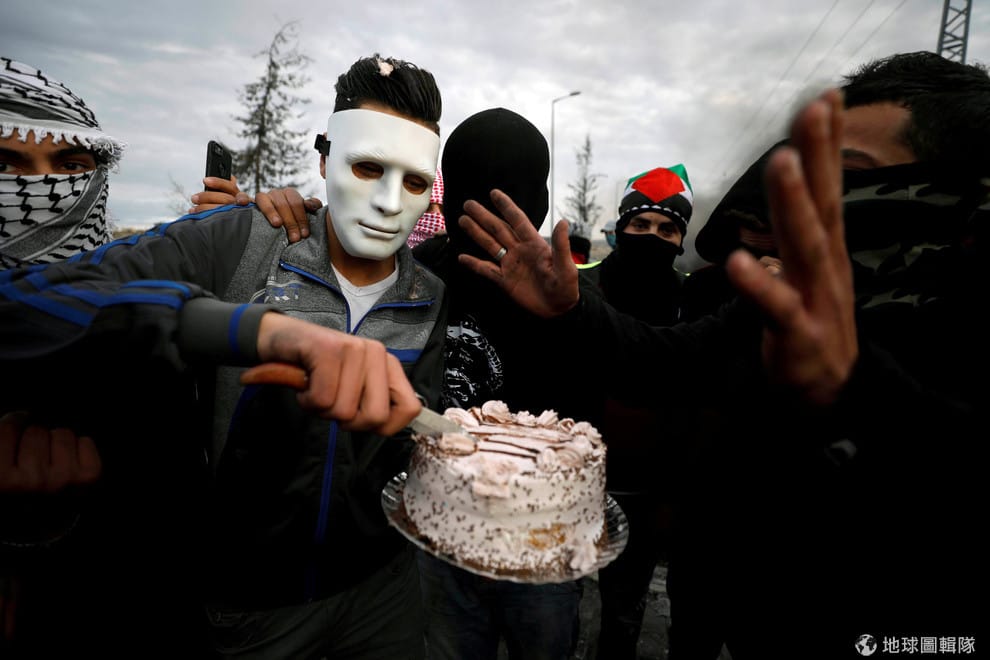 在以色列定居地Beit El前,來自巴勒斯坦城市拉姆安拉(Ramallah)的抗議者戴著面具,一邊切生日蛋糕一邊抗議美國政府在本月 6號承認耶路撒冷為以色列首都,還打算把大使館搬到耶路撒冷,而現在世界各地均出現相關抗議。