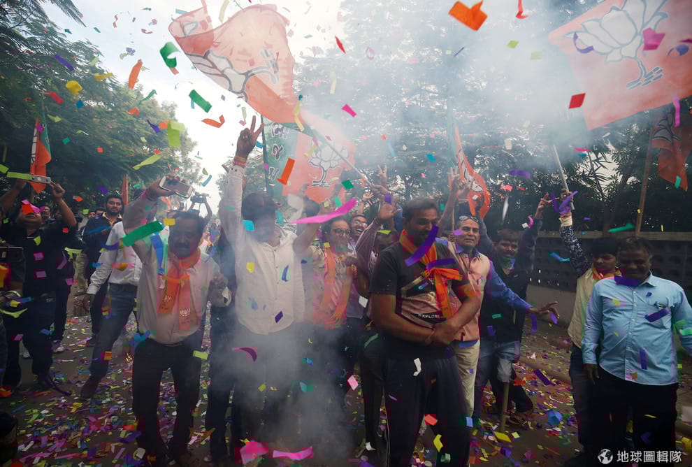 在印度西北與古吉拉特邦的第一大城艾哈邁達巴德(Ahmedabad),印度總理莫迪(Narendra Modi)所屬的印度人民黨(Bharatiya Janata Party,BJP)支持者在黨部外慶祝,為高民調手舞足蹈放鞭炮。