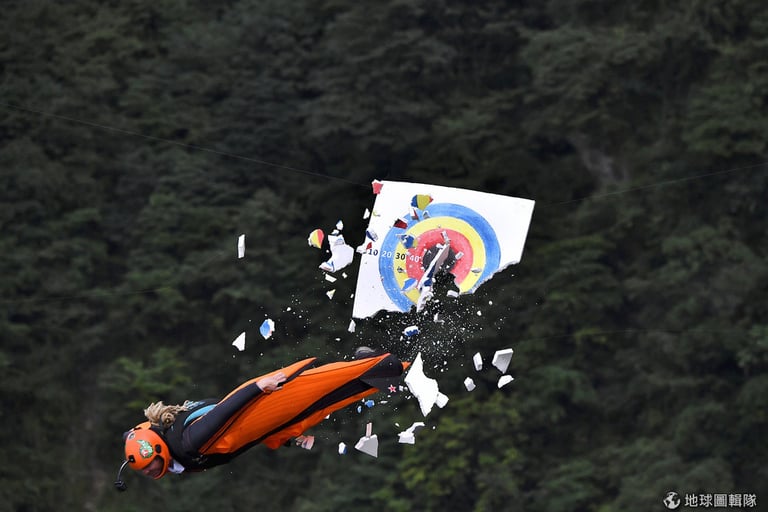 河南省景谷在今年 9月舉行了中國翼裝飛行世界杯,只見一名參賽者穿著翼裝,瞄準好分數一「頭」飛了出去。