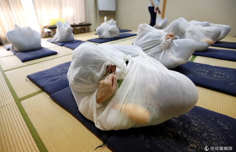 今年 2月,在埼玉縣參加「成人捲」(Otonamaki)抒壓課程的學員,在老師的指導下用白布把自己包成一團,遠看就像一個個包袱,據說這麼做可以舒緩姿勢不良和身體僵硬的問題,帶給人滿滿的安心感。