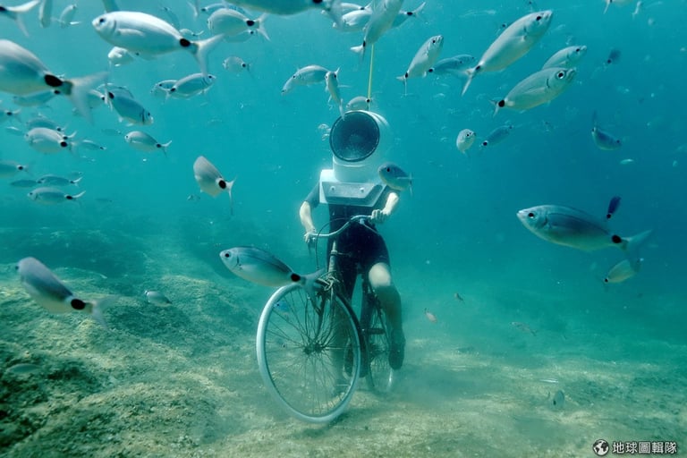 在南部普拉市(Pula)的水底公園,一名遊客潛到水下騎腳踏車。