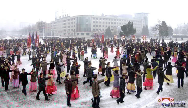 24號這天,是已故北韓領導人金日成的妻子金正淑的百歲冥誕,人們來到平壤廣場上跳舞慶祝。