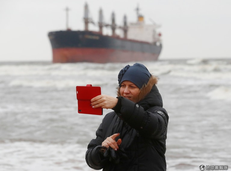 在立陶宛位於波羅的海的克萊佩達(Klaipeda)海港,一名女子拿起手機和身後擱淺的海洋王冠(Ocean Crown)貨船拍照。