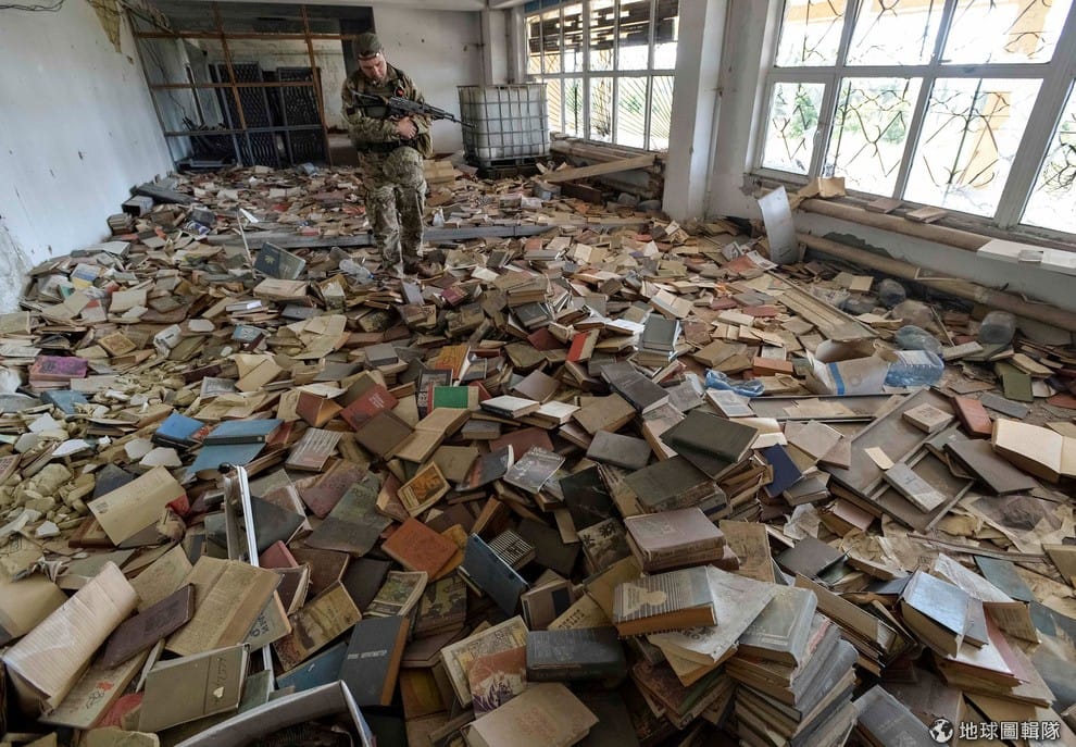 今年 9月,在靠近烏克蘭城市馬林卡(Maryinka)的廢棄圖書館,一名烏克蘭軍人小心地走過已經沒人翻閱的書堆。