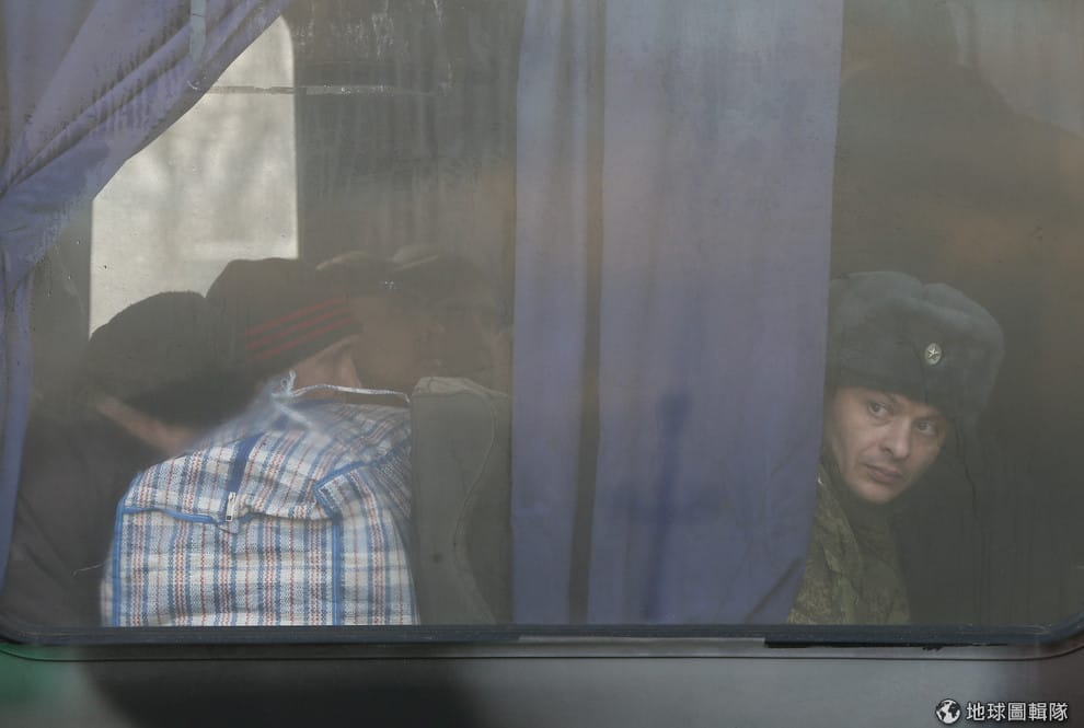 來自東烏克蘭的人們搭上接駁車,帶著行李準備回到他們熟悉的地方。