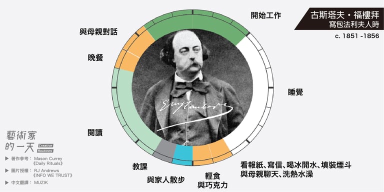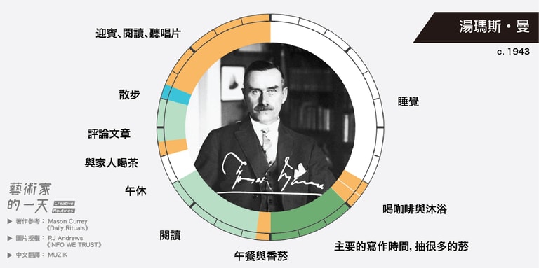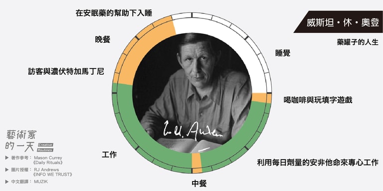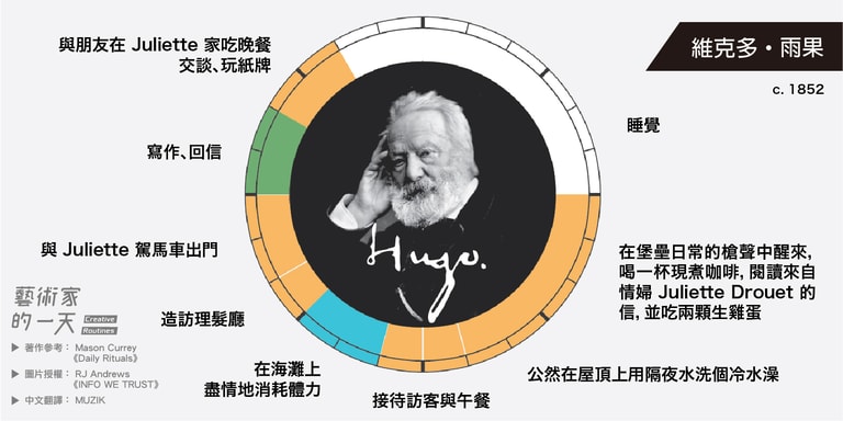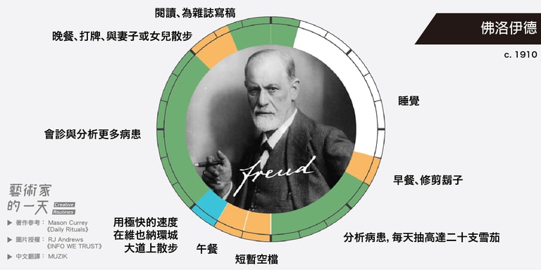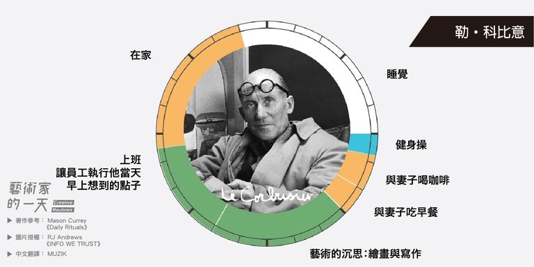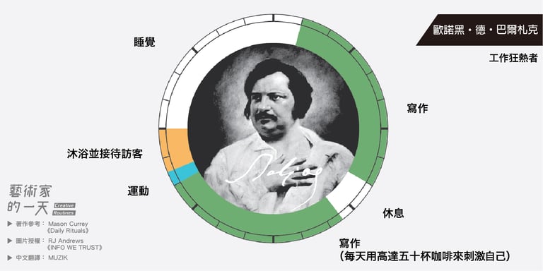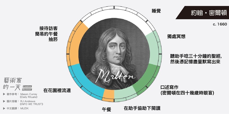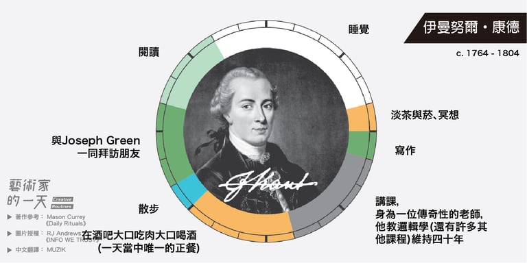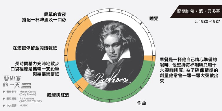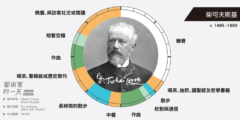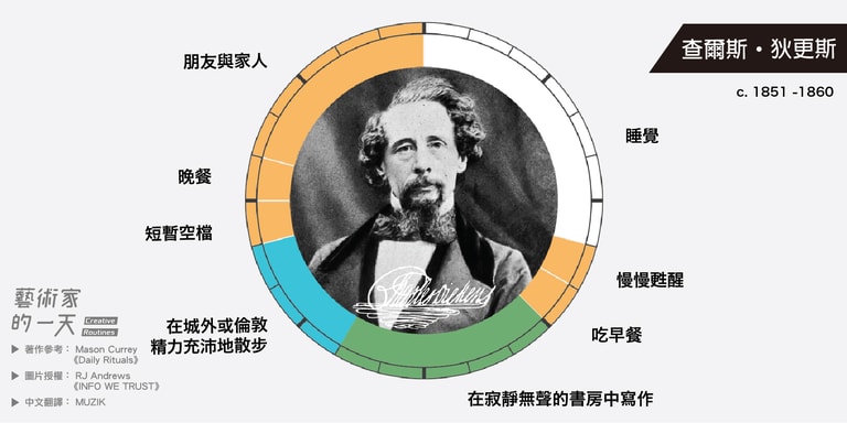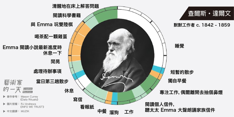 這些圖片是由 RJ Andrews 於2014年繪製,他是受到 Mason Currey 的著作《Daily Rituals》啟發而創作的,英文版的原圖可以致 RJ Andrews 架設的官網 infowetrust 查看。如果對 Mason Currey 的《Daily Rituals》有興趣的朋友也可以點連結購買。
