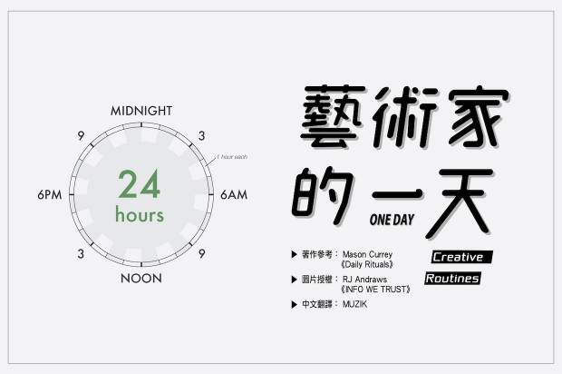 以上分享的 16 位藝術家的 24 小時,有些是針對創作某一部作品時的狀態,有些則是維持了好幾年的生活作息。這樣的分享並不是希望大家模仿,畢竟有些人一天花 2 個小時就可以完成的事,另一些人可能要花上 10 小時處理。找到自己最舒適的創作習慣,並規律執行或許才是作者最想傳達的理念吧!