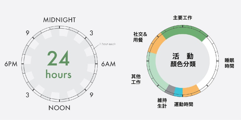 圖表將圓形分成24等份,一格代表一小時,正上方是凌晨,正下方則是正午。可以觀察每位藝術家的睡眠時間差異。另外利用顏色區別不同類型的活動,白色為睡眠時間;橘色為社交與用餐時間;藍色是運動時間;灰色是用於維持生計;深綠與淺綠則分別代表主要與次要工作。