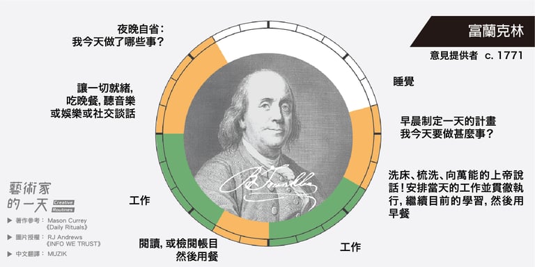 班傑明·富蘭克林,是美國著名政治家、科學家,同時亦是出版商、印刷商、記者、作家、慈善家;更是傑出的外交家及發明家。身兼多職的他大概是上列所有名人中最嚴謹規劃每一天的人了。