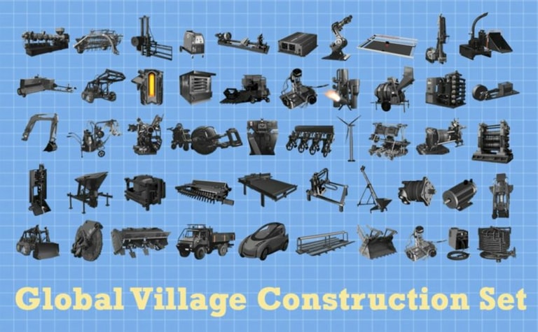 這 50 個機具的名稱是全球農莊建設組(Global Village Construction Set,縮寫 GVCS),畢竟農業就是物質文明之母。涵蓋的機具從發電機、太陽能發電、怪手、拖拉機、濾水器、馬達一直到 CNC 機具、機械手、3D 列印機、卡車等都有。