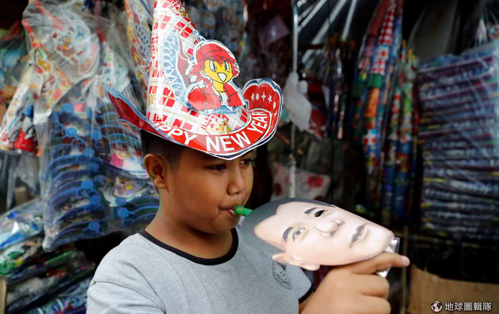 在首都馬尼拉的街頭,攤販們開始賣起跨年用品,其中,黏有總統杜特蒂(Rodrigo Duterte)面具的號角受到不少民眾的青睞。
