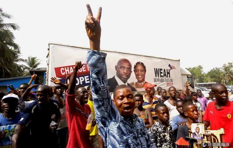 民眾開心地為前球壇傳奇維阿(George Weah)當選總統而慶祝,維阿在從球壇引退前是全世界唯一來自非洲贏得「足球先生」封號的選手。
