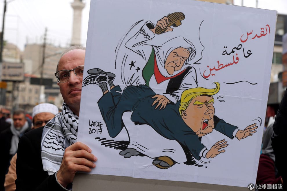 在首都安曼(Amman),反對美國總統川普(Donald Trump)認耶路撒冷為以色列首都的民眾,舉著一張巴勒斯坦人打川普屁股的海報,海報上寫著「耶路撒冷是巴勒斯坦的首都」。