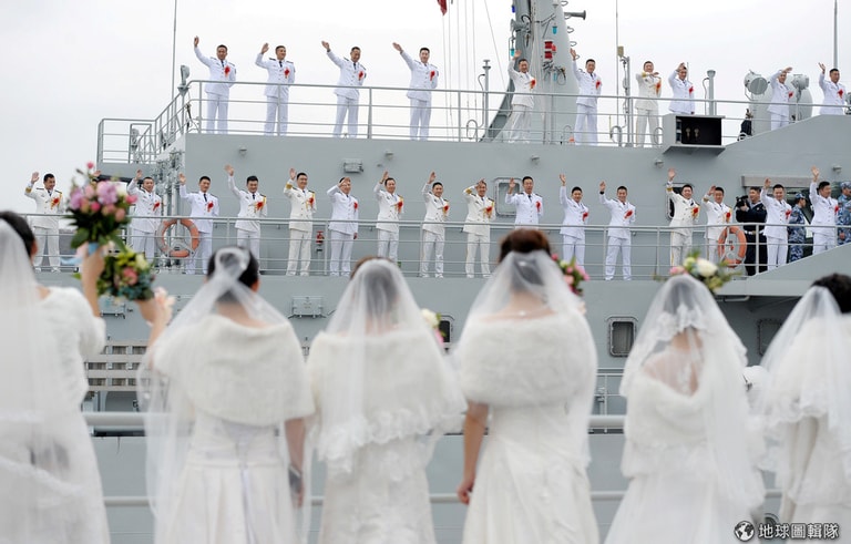 在浙江省舟山市,一場別開生面的集團婚禮在海軍基地舉辦,擔任海軍的新郎們向站在岸邊的新娘們揮手。