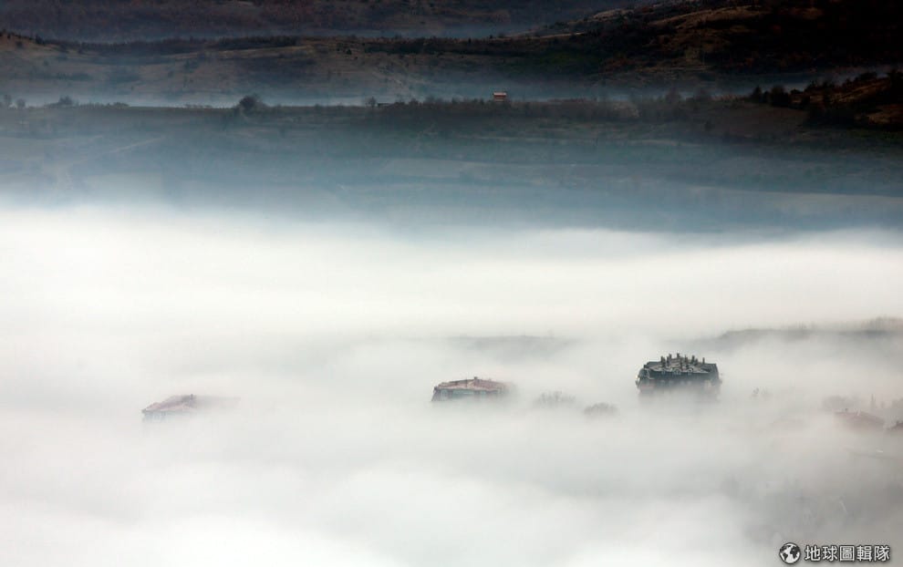 濃濃大霧遮住了首都史高比耶(Skopje),僅有高樓大廈冒出頭。