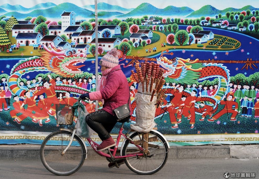 在北京街頭,一名小販踩著插有一支支糖葫蘆的單車經過一張喜氣洋洋的海報。