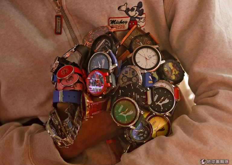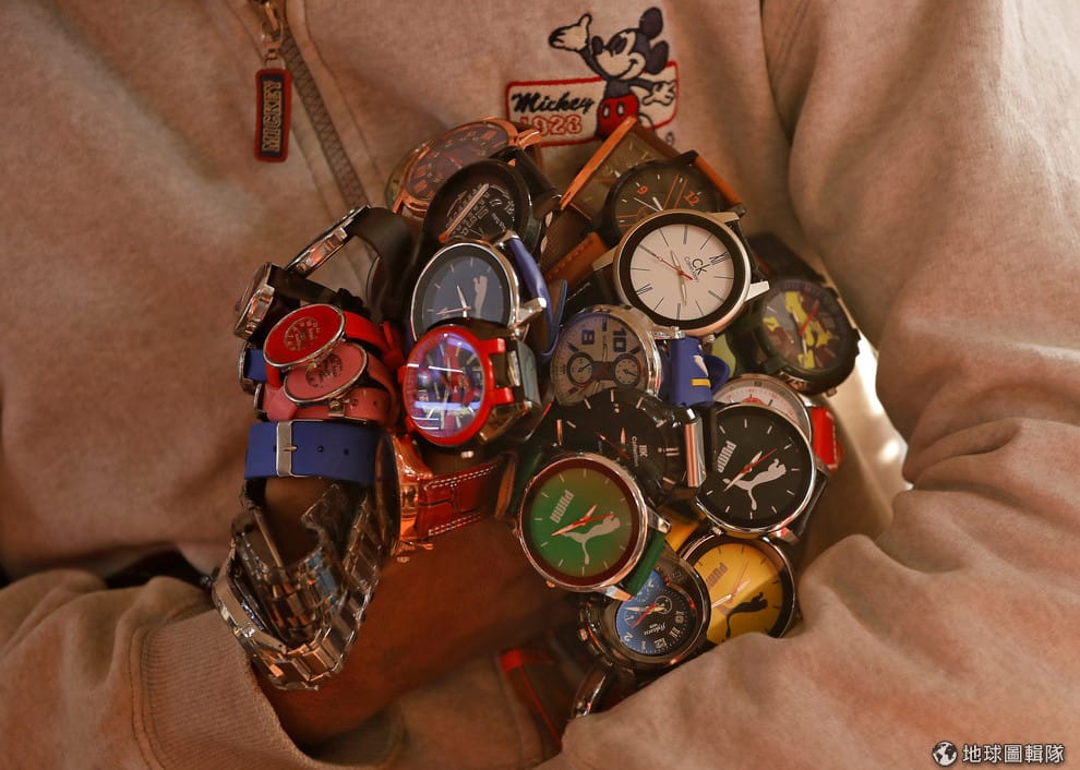 在新德里的公車站,一名小販抱著一堆手錶準備推銷給來來往往的客人。