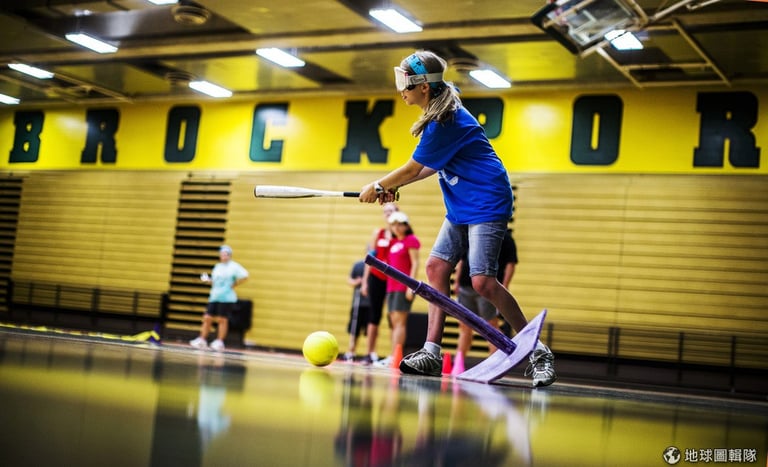 盲人棒球(Beep Baseball)是為視障人士設計的棒球運動,棒球會發出嗶嗶聲,讓視障者可以聽聲音分辨位置。照片中女孩簡(Anastasia Gian)正揮棒擊打棒球。