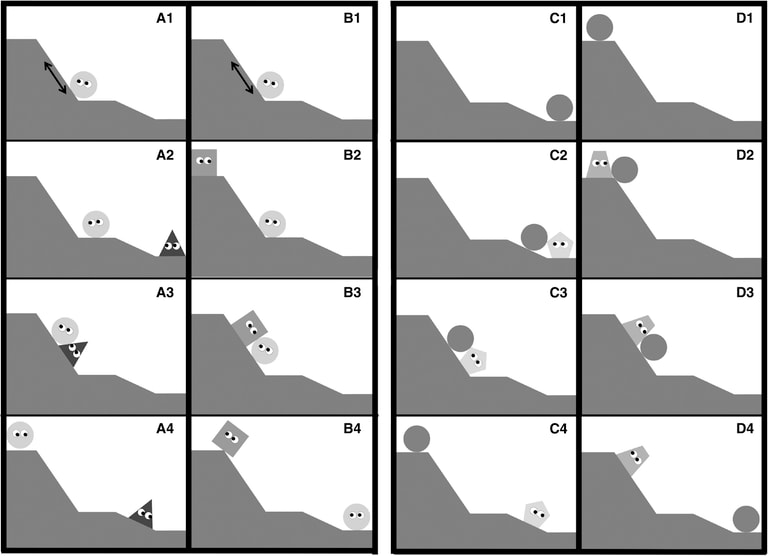首先,在第一個實驗中,研究人員給 24隻倭黑猩猩看了一部動畫片,片中有個長得像小精靈(Pac-Man)的角色想要爬到山頂,另一個好角色會幫它一把,而另一個壞角色則會想辦法把它拉下來。