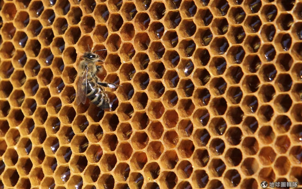 一隻蜜蜂停在蜂巢上,密密麻麻的蜂巢有時會讓觀者產生噁心的感覺。