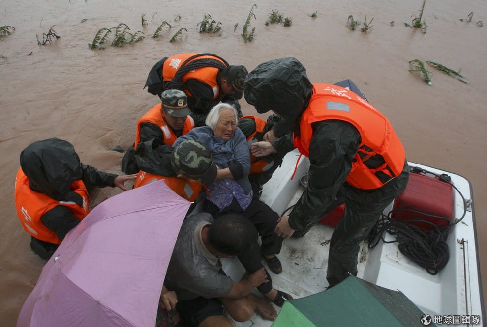 搜救人員小心翼翼的將一名老人抬進救生艇。
