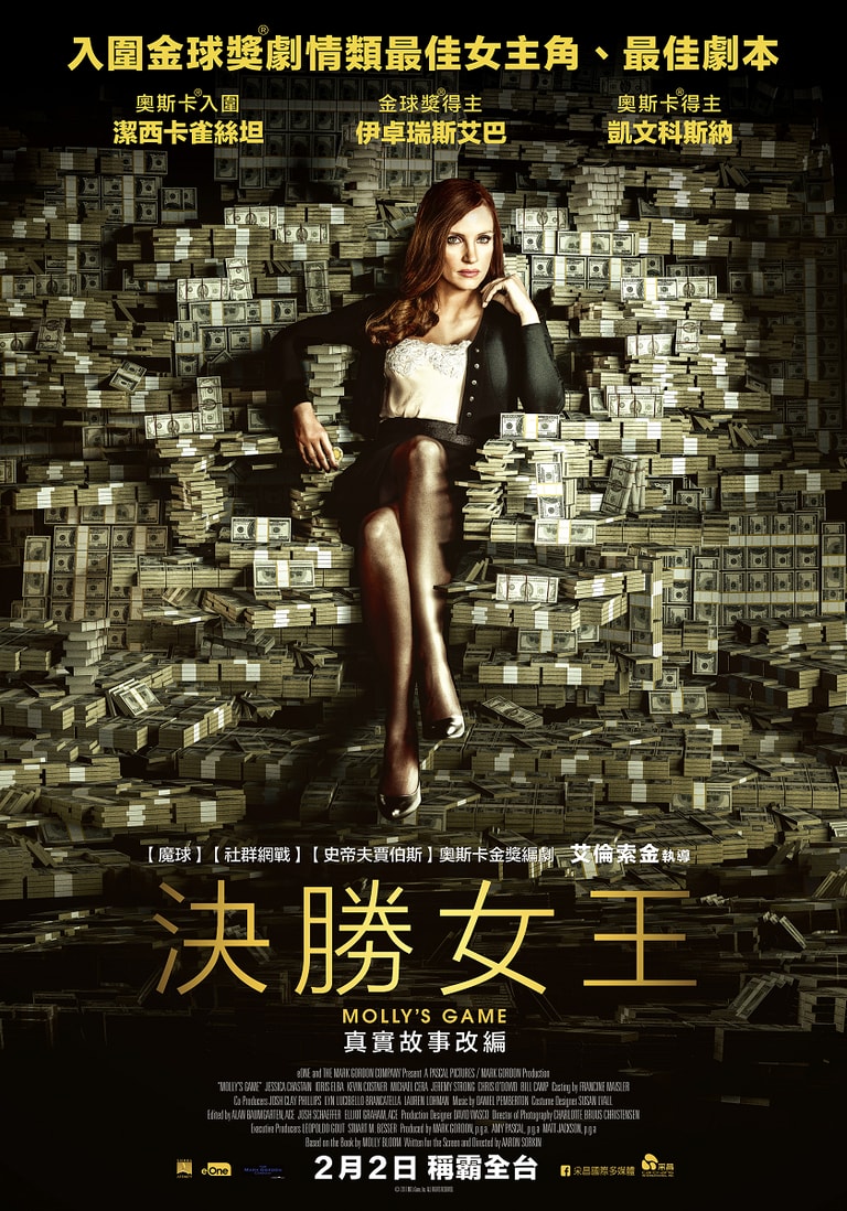 在《決勝女王》這部改編自真實事件的電影中,曾獲金球獎影后的好萊塢影星潔西卡崔斯坦(Jessica Chastain)飾演女主角茉莉布魯(Molly Bloom),她曾是一名世界級的滑雪選手,然而在角逐奧運失利之後,轉而擔任富商秘書,並協助老闆籌劃私人賭局。