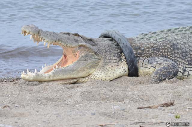 一隻鱷魚脖子掛著摩托車輪胎,在沙灘邊曬著日光浴。