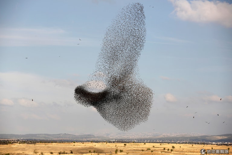 在以色列上空,成群的椋鳥從歐洲中部與東部地區千里迢迢地飛到此地過冬,畫面中的無數黑點都是椋鳥。